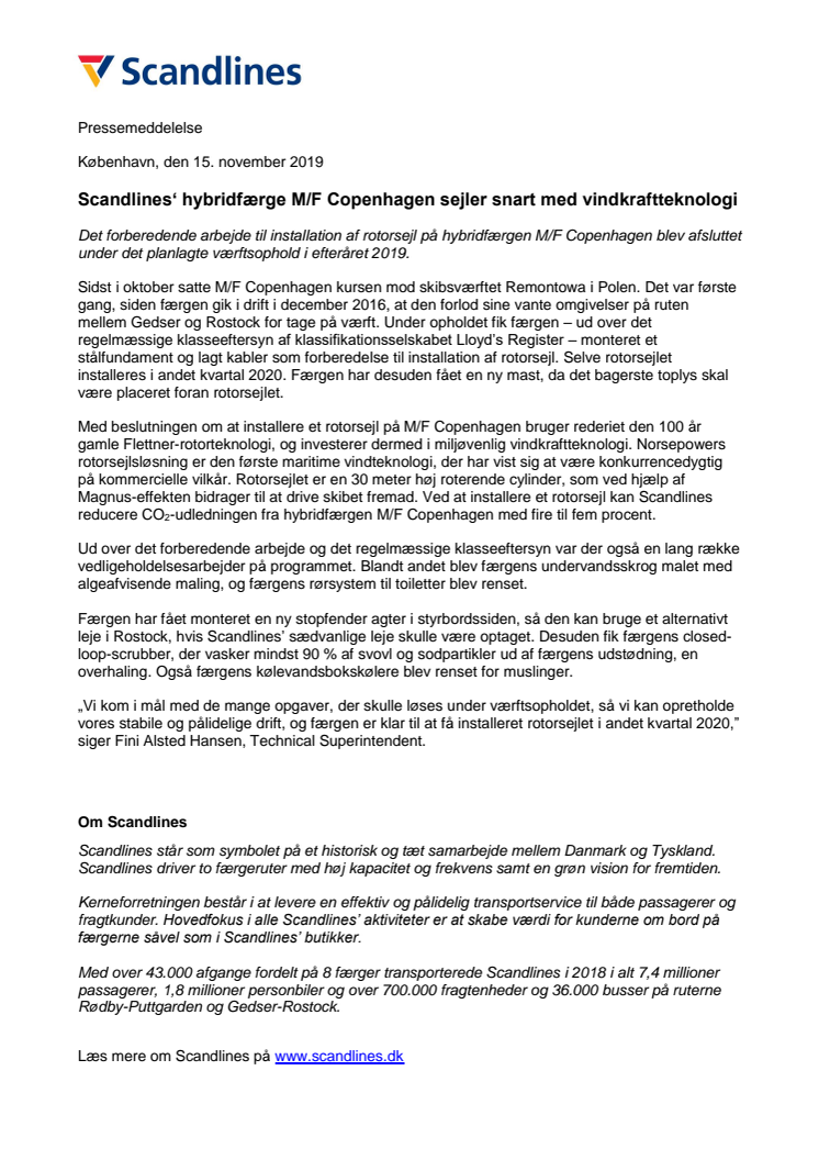 Scandlines‘ hybridfærge M/F Copenhagen sejler snart med vindkraftteknologi