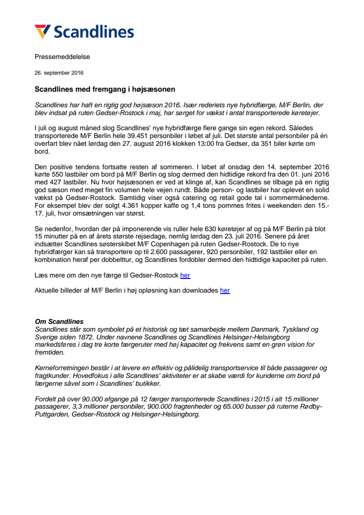 Scandlines har haft en rigtig god højsæson 2016. Især rederiets nye hybridfærge, M/F Berlin, der blev indsat på ruten Gedser-Rostock i maj, har sørget for vækst i antal transporterede køretøjer.