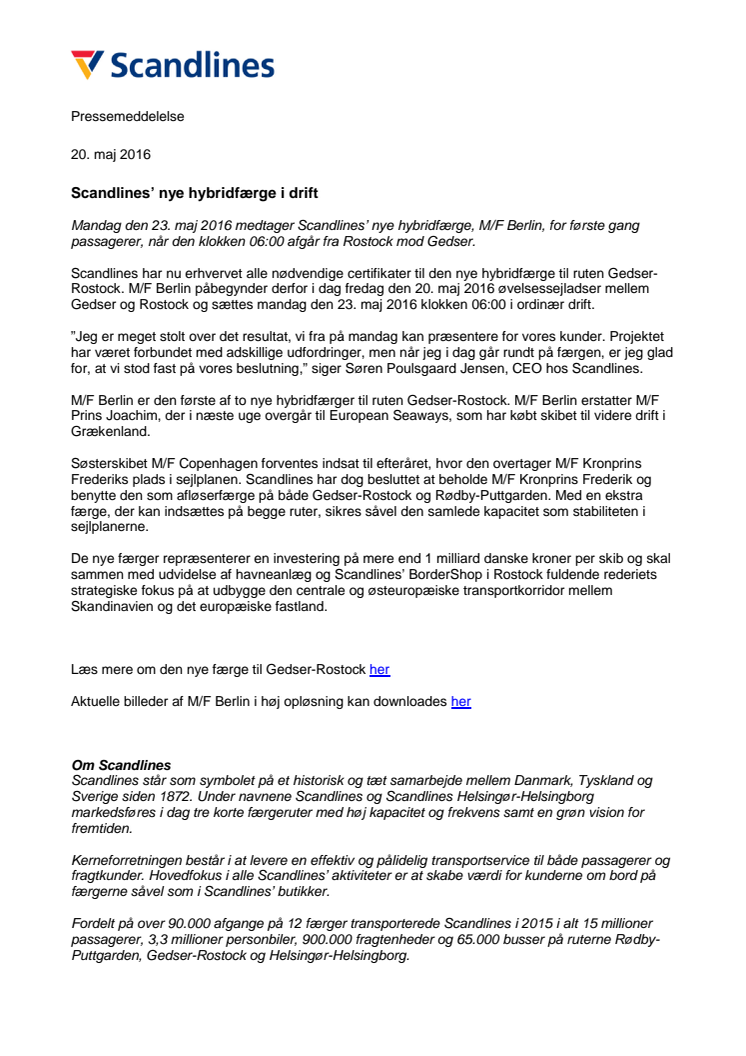 Mandag den 23. maj 2016 medtager Scandlines’ nye hybridfærge, M/F Berlin, for første gang passagerer, når den klokken 06:00 afgår fra Rostock mod Gedser.