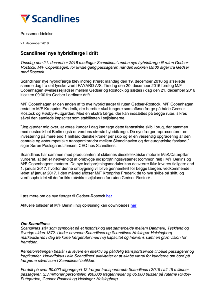 Onsdag den 21. december 2016 medtager Scandlines’ anden nye hybridfærge til ruten Gedser-Rostock, M/F Copenhagen, for første gang passagerer, når den klokken 09:00 afgår fra Gedser mod Rostock.