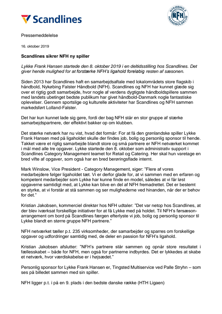 Lykke Frank Hansen startede den 8. oktober 2019 i en deltidsstilling hos Scandlines. Det giver hende mulighed for at forstærke NFH’s ligahold foreløbig resten af sæsonen.