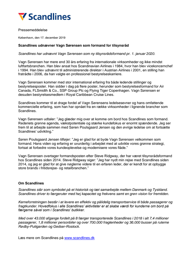 Scandlines har udnævnt Vagn Sørensen som ny tilsynsrådsformand pr. 1. januar 2020.