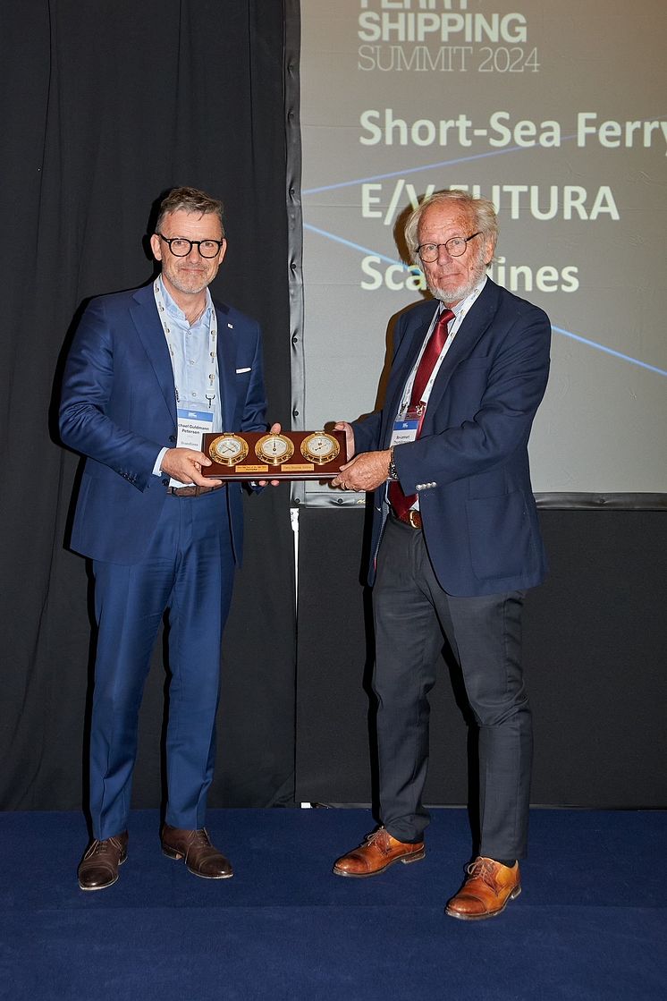 During the Ferry Shipping Summit in Athens 07 and 08 November 2024, Scandlines received an award for the new zero direct emissions freight ferry Futura in the category Short-Sea Ferry of the Year 2024. From the left: Scandlines COO Michael Guldmann Petersen and President, Ferry Shipping Summit & News Bo-Lennart Thorbjörnsson.