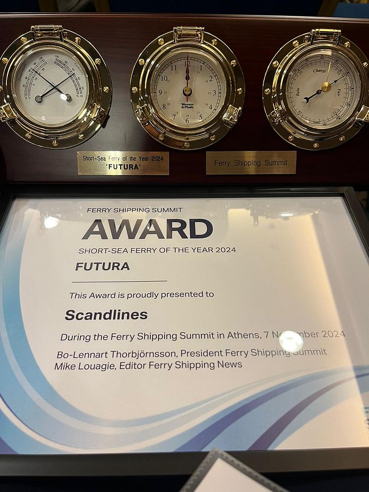 During the Ferry Shipping Summit in Athens 07 and 08 November 2024, Scandlines received an award for the new zero direct emissions freight ferry Futura in the category Short-Sea Ferry of the Year 2024.