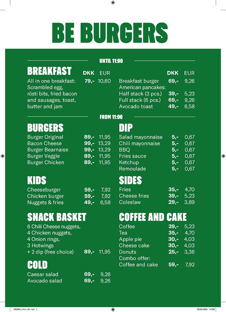 BE BURGERS menu