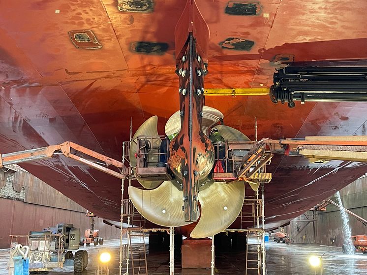 Scandlines hybrid ferry Copenhagen operating on the Rostock-Gedser route; 1 new centre propeller blade installed