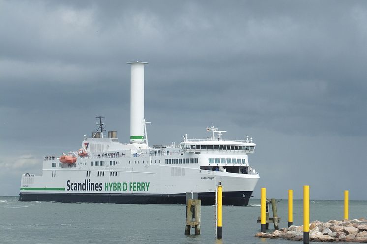 Scandlines hybrid ferry Copenhagen with rotor sail in Warnemünde