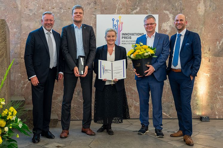 Scandlines wins innovation award of the German mobility industry 2024, award ceremonu at St Paul's Church in Frankfurt am Main(from left Prof. Knut Ringat, Rhein-Main-Verkehrsverbund GmbH, Head of Business Administration & Special Projects Marko Möller, Scandlines, Head of Corporate Communications, Anette Ustrup Svendsen, Scandlines, Prof. Dr. Sönke Reise, University of Wismar, Prof. Dr. Jan Ninnemann, Deutsche Verkehrswissenschaftliche Gesellschaft e. V.)