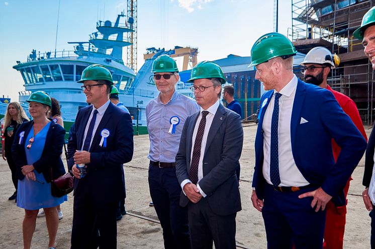 Keel laying of the Scandlines zero direct emission ferry at Cemre Shipyard, Scandlines Head of Corporate Communications Anette Ustrup Svendsen, Scandlines COO Michael Guldmann Petersen, Naval Architect Johannes Johanneson, Ship broker Jens Vind, Scandlines VP Procurement Kenneth Bjerge Nielsen