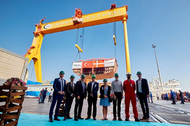 Keel laying of the Scandlines zero direct emission ferry at Cemre Shipyard, Scandlines VP Procurement Kenneth Bjerge Nielsen, Ship broker Jens Vind, Scandlines COO Michael Guldmann Petersen, Scandlines Superintendent Christian Thiemer, Scandlines Head of Corporate Communications Anette Ustrup Svendsen, Naval Architect Johannes Johanneson, Scandlines Naval Architect Rasmus Nielsen