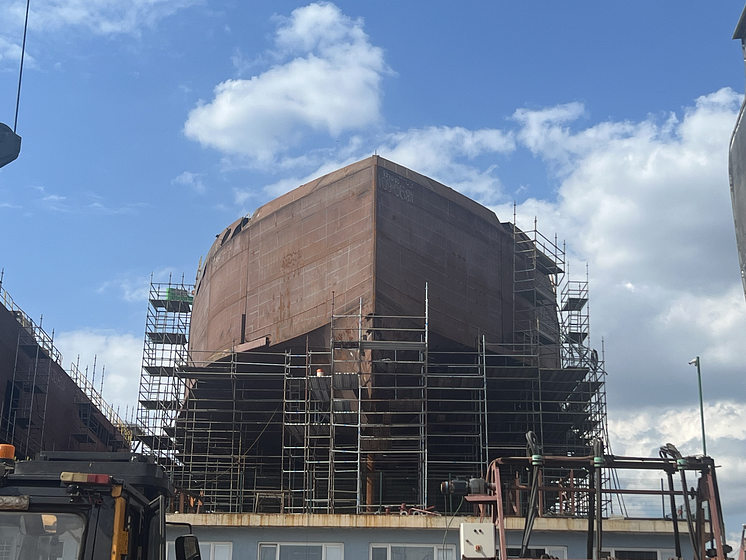 The hull of the Scandlines zero direct emission ferry PR24 on the slipway - forward
