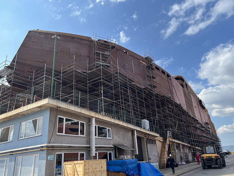 The hull of the Scandlines zero direct emission ferry PR24 on the slipway - portside