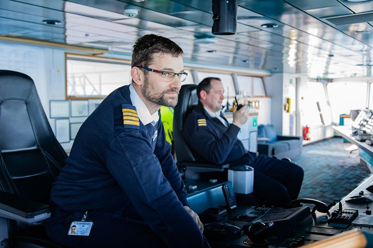Scandlines captain Stefan Wehland and chief mate Thomas Bischoff on the bridge of the Scandlines hybrid ferry Berlin