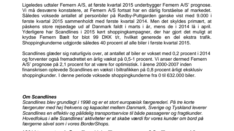Ligeledes udtaler Femern A/S, at første kvartal 2015 underbygger Femern A/S’ prognose. Vi må desværre konstatere, at Femern A/S fortsat har en dårlig forståelse af markedet. Således voksede antallet af personbiler på Rødby-Puttgarden ganske vist med 9.000 i første kvartal 2015 sammenholdt med første kvartal 2014. Men det skyldes primært, at påskens store rejsedage ud af Danmark faldt i marts i år, mens de i 2014 lå i april. Yderligere har Scandlines i 2015 kørt shoppingkampagner, der har gjort det muligt at krydse Femern Bælt for blot 99 DKK t/r, hvilket generede en del ekstra trafik. Shoppingkunderne udgjorde således 40 procent af alle biler i første kvartal 2015.