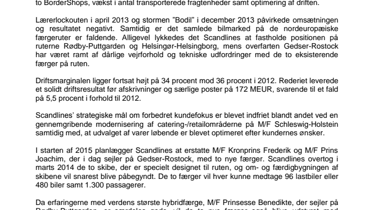 Lærerlockouten i april 2013 og stormen ”Bodil” i december 2013 påvirkede omsætningen og resultatet negativt. Samtidig er det samlede bilmarked på de nordeuropæiske færgeruter er faldende. Alligevel lykkedes det Scandlines at fastholde positionen på ruterne Rødby-Puttgarden og Helsingør-Helsingborg, mens overfarten Gedser-Rostock har været ramt af dårlige vejrforhold og tekniske udfordringer med de to eksisterende færger på ruten.