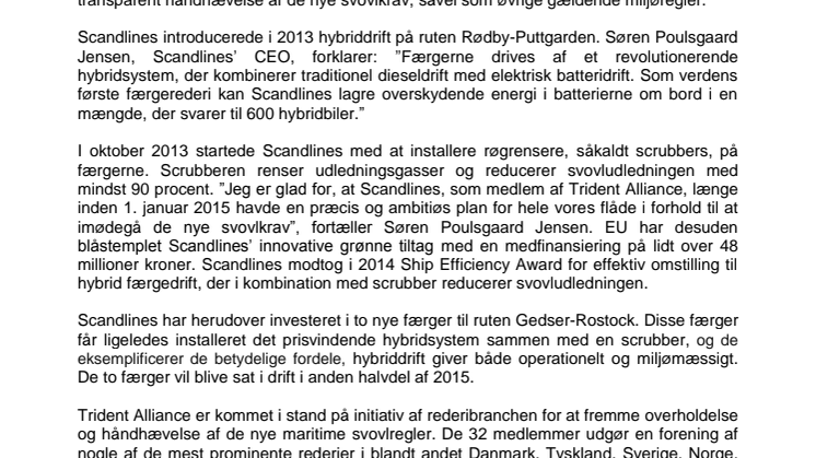 Trident Alliance er en sammenslutning af rederier, der samarbejder om håndhævelse af alle maritime svovlkrav eksempelvis de nye svovlkrav gældende fra 1. januar 2015. Scandlines støtter initiativet for at sikre og engagere sig i, at reglerne implementeres på en miljø- og konkurrencemæssig måde.