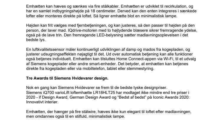 En luftkvalitetssensor måler kontinuerligt udviklingen af damp og mados fra kogepladen, og justerer udsugningseffekten nøjagtigt til det. Ud over automatisk betjening kan alle funktioner også betjenes individuelt. Emhætten kan tilsluttes Home Connect-appen via Wi-Fi, til et udvalg af Siemens kogeplader eller andre smart-enheder. Det betyder, at emhætten kan betjenes direkte fra kogepladen eller via mobiltelefon, tablet eller stemmestyring.