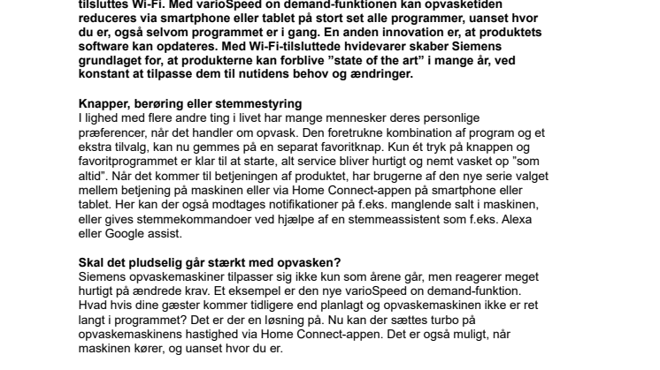 Opvaskemaskinens fremtid starter nu, da alle Siemens modellerne i den nye generation af opvaskemaskiner – fra basismodellen til topmodellen - kan tilsluttes Wi-Fi. Med varioSpeed on demand-funktionen kan opvasketiden reduceres via smartphone eller tablet på stort set alle programmer, uanset hvor du er, også selvom programmet er i gang. En anden innovation er, at produktets software kan opdateres. Med Wi-Fi-tilsluttede hvidevarer skaber Siemens grundlaget for, at produkterne kan forblive ”state of the art” i mange år, ved konstant at tilpasse dem til nutidens behov og ændringer.