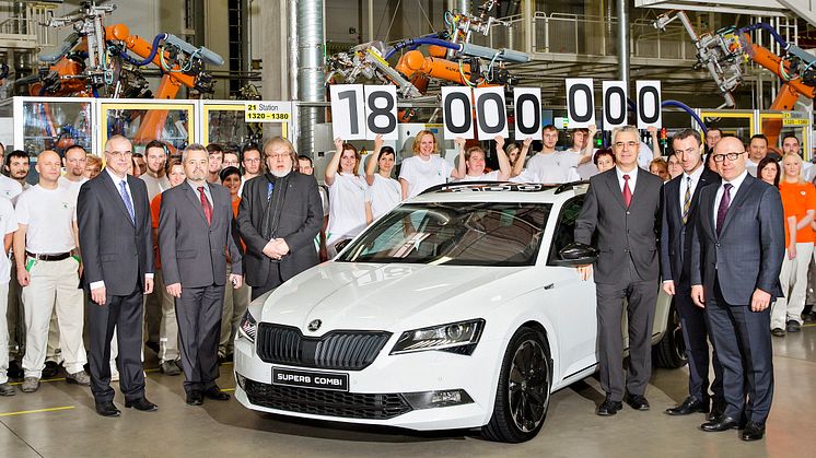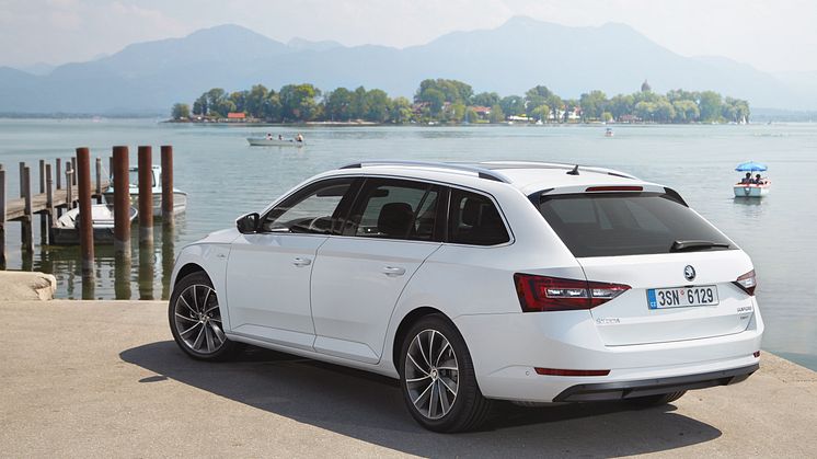 På billedet ses den hvide SKODA Superb Combi jubilæumsbil.