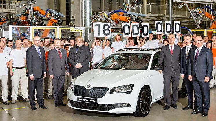 På billedet ses den hvide SKODA Superb Combi jubilæumsbil.