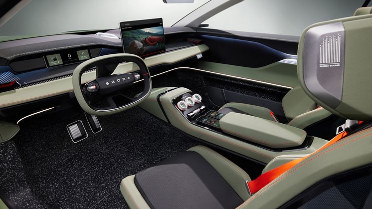 Apropos udsyn har ŠKODA VISION 7S et nydesignet rat, der er fladt i top og bund, så det ikke tager udsynet til det digitale cockpit. Desuden vil tilhængere af knapper, der giver hurtig og sikker betjening af udvalgte funktioner i stedet for at skulle betjene alt på én skærm, glæde sig over, at ŠKODA bevarer dem i VISION 7S. De har tilmed haptisk berøringsfeedback, ligesom knapperne på rattet og i dørene også har det.
