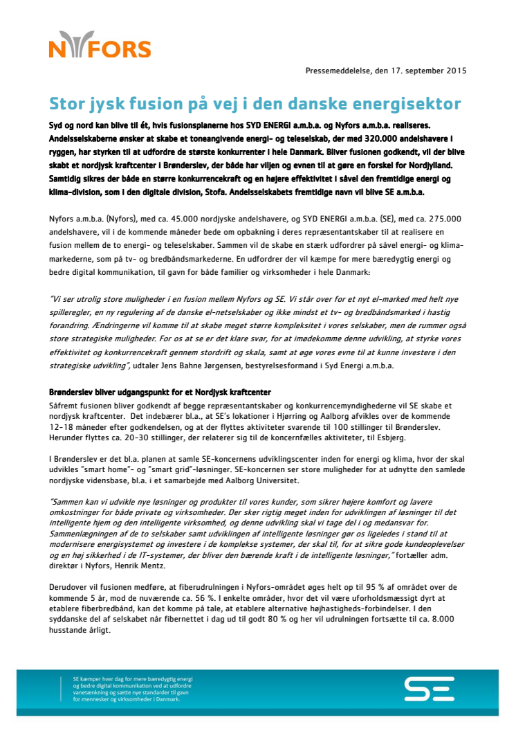 Syd og nord kan blive til ét, hvis fusionsplanerne hos SE og Nyfors realiseres. Andelsselskaberne får med 320.000 andelshavere i ryggen, en endnu større styrke til at udfordre de største konkurrenter i hele Danmark. Godkendes fusionen, skabes der et nyt nordjysk kraftcenter i Brønderslev. Samtidig sikres der større konkurrencekraft og en højere effektivitet i såvel SE Energi & Klima, som i Stofa.