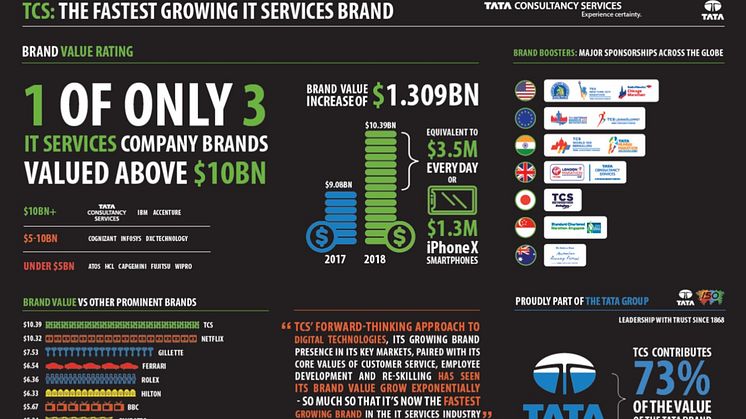 Ifølge Brand Finances 2018-rapport har TCS en total brandværdi på over 10 mia. USD. Det er en vækst på 14,4 % fra forrige års totale brandværdi. TCS oplever den hurtigst stigende vækst i sektoren, og de imponerende tal placerer TCS i Top 3 over de mest værdifulde brands inden for globale it-tjenester – kun overgået af IBM og Accenture, der ligger på hhv. første- og andenpladsen. Brand Finances årlige rapport analyserer værdi og styrke af 5.000 af de største brands i verden fordelt over 38 industrier.