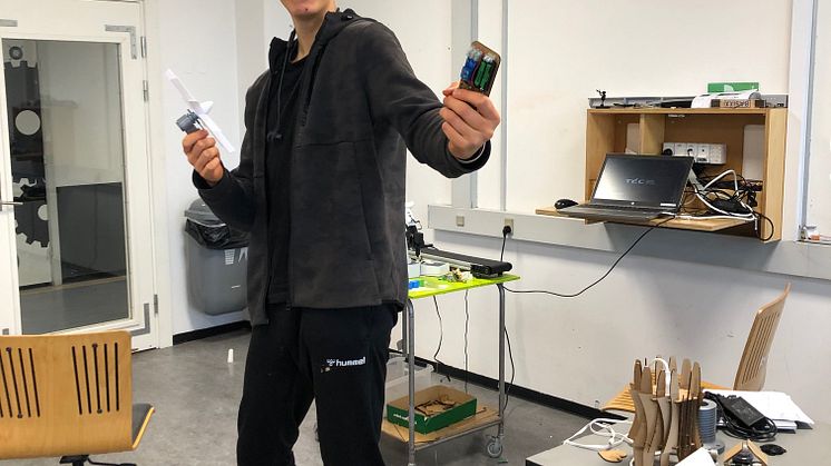Dobot’en - den lille multifunktionelle robotarm i skrivebordstørrelse er ikke bare robotteknologiens svar på en schweizerkniv, den kan også programmeres, så man kan styre den med en hånd. Det har den 17-årige elev, Emil Svansø Nielsen programmeret den til. Han går på grundforløb 1 på Digital Solutions and Robotics på TEC på Frederiksberg.