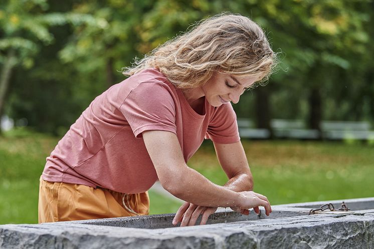 Bad Wörishofen: Frau nutzt Armbadebecken im Kurpark; Kneipp'sche Anwendung