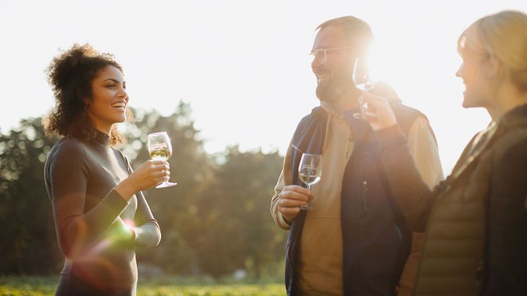 Ingelheim am Rhein: En mand og to kvinder med vinglas på en vingård © DZT / Julia Nimke
