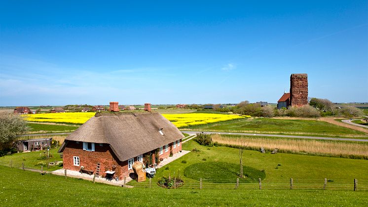 Pellworm: Udsigt til stråtægthus og kirke © Lookphotos/ Sabine Lubenow