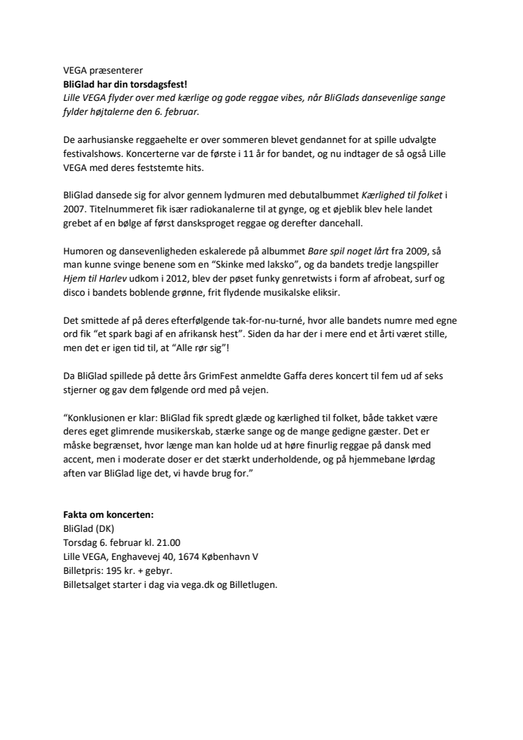 “Konklusionen er klar: BliGlad fik spredt glæde og kærlighed til folket, både takket være deres eget glimrende musikerskab, stærke sange og de mange gedigne gæster. Det er måske begrænset, hvor længe man kan holde ud at høre finurlig reggae på dansk med accent, men i moderate doser er det stærkt underholdende, og på hjemmebane lørdag aften var BliGlad lige det, vi havde brug for.”