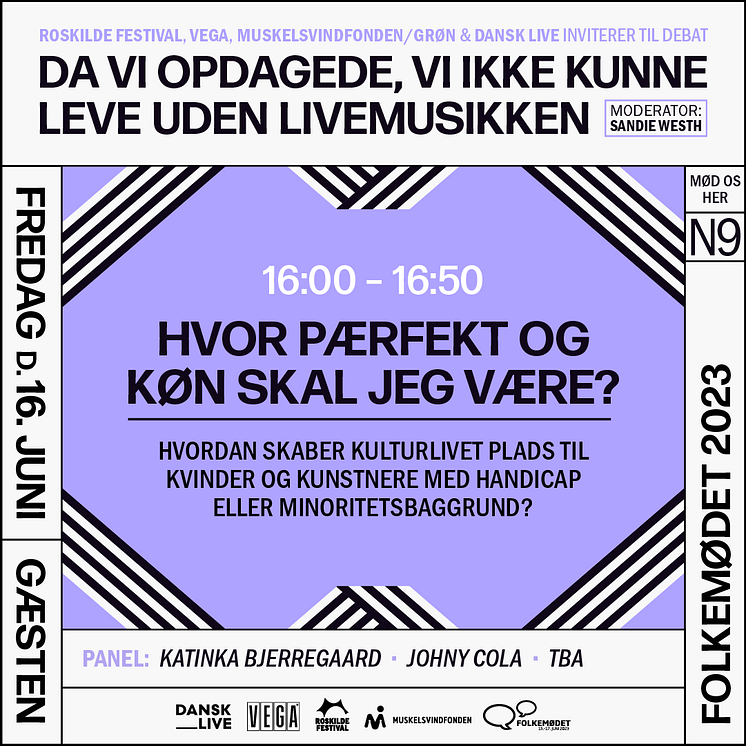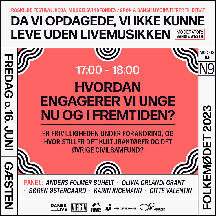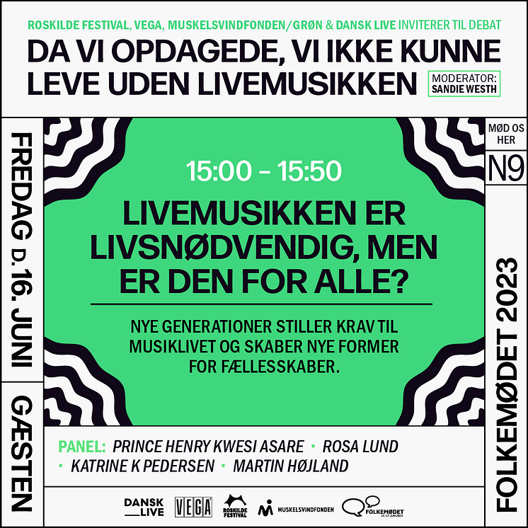 VEGA, Muskelsvindfonden/Grøn og Roskilde Festival går sammen på Folkemødet. De tre store kulturinstitutioner inviterer på fredag på Gæstgiveren i Allinge i samarbejde med Dansk Live til debatter og musik. Kom og bliv klogere på, hvorfor vi ikke kan undvære det fællesskab, live-musikken giver os.