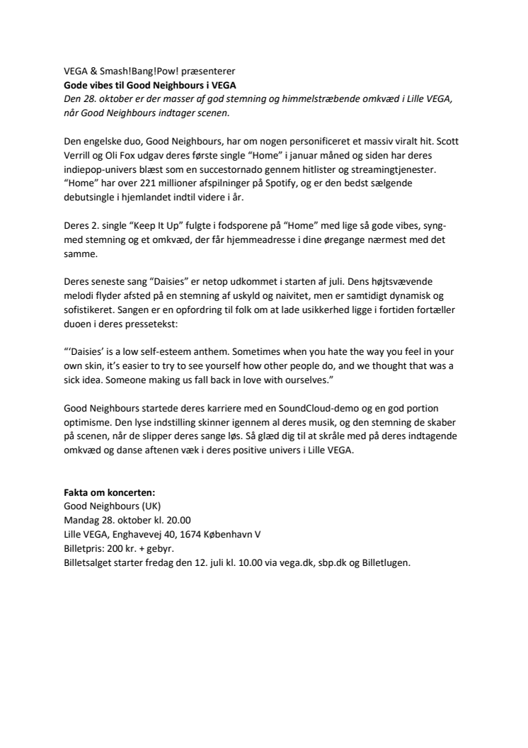 Good Neighbours startede deres karriere med en SoundCloud-demo og en god portion optimisme. Den lyse indstilling skinner igennem al deres musik, og den stemning de skaber på scenen, når de slipper deres sange løs. Så glæd dig til at skråle med på deres indtagende omkvæd og danse aftenen væk i deres positive univers i Lille VEGA.