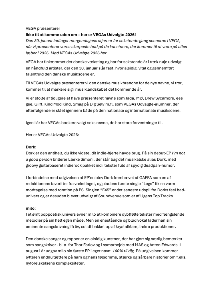 Den 30. januar indtager morgendagens stjerner for sekstende gang scenerne i VEGA, når vi præsenterer vores skarpeste bud på de kunstnere, der kommer til at være på alles læber i 2026.