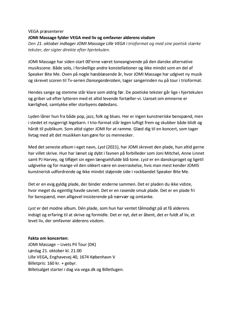Den 21. oktober indtager JOMI Massage Lille VEGA i trioformat og med sine poetisk stærke tekster, der sigter direkte efter hjertekulen.