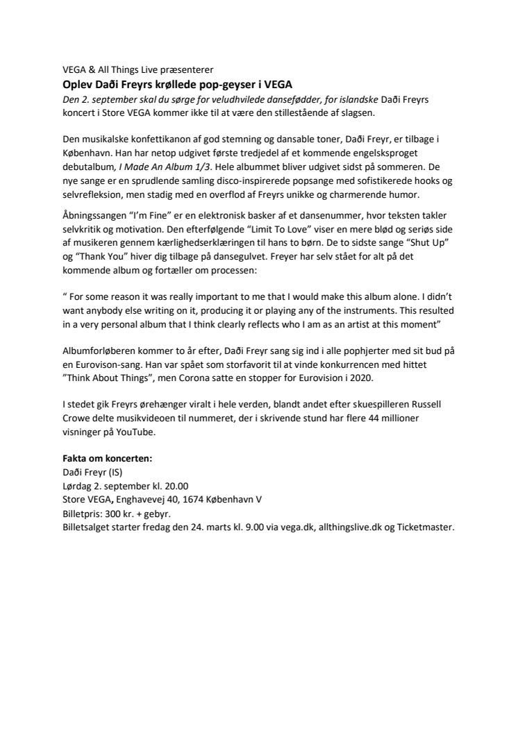 Den musikalske konfettikanon af god stemning og dansable toner, Daði Freyr, er tilbage i København. Han har netop udgivet første tredjedel af et kommende engelsksproget debutalbum, I Made An Album 1/3. Hele albummet bliver udgivet sidst på sommeren. De nye sange er en sprudlende samling disco-inspirerede popsange med sofistikerede hooks og selvrefleksion, men stadig med en overflod af Freyrs unikke og charmerende humor.