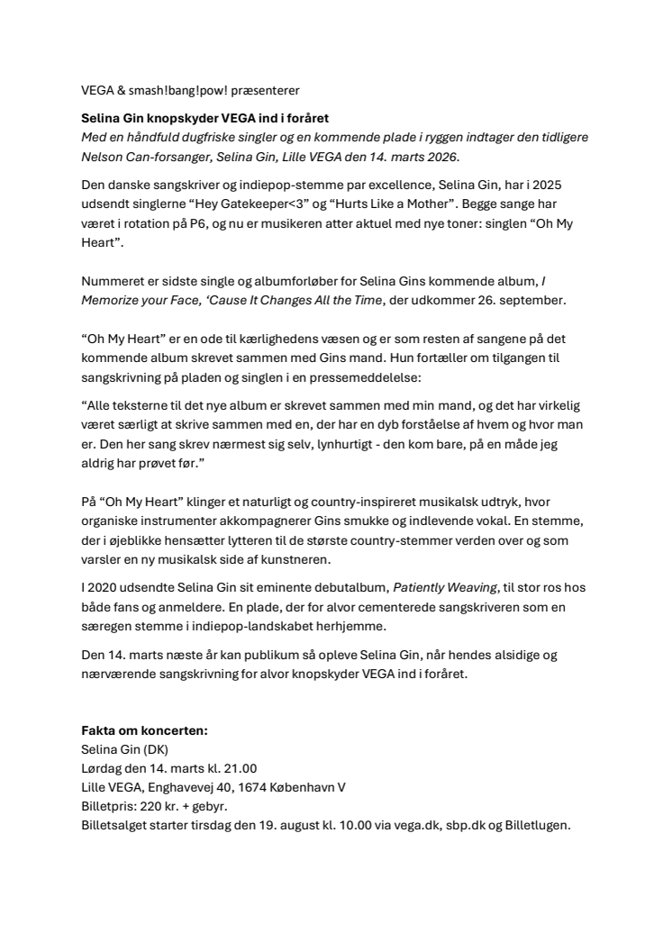 Den 14. marts næste år kan publikum så opleve Selina Gin, når hendes alsidige og nærværende sangskrivning for alvor knopskyder VEGA ind i foråret.