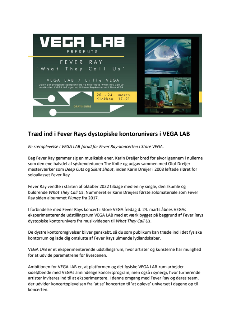 I forbindelse med Fever Rays koncert i Store VEGA fredag d. 24. marts åbnes VEGAs eksperimenterende udstillingsrum VEGA LAB med et værk bygget på baggrund af Fever Rays dystopiske kontorunivers fra musikvideoen til What They Call Us.