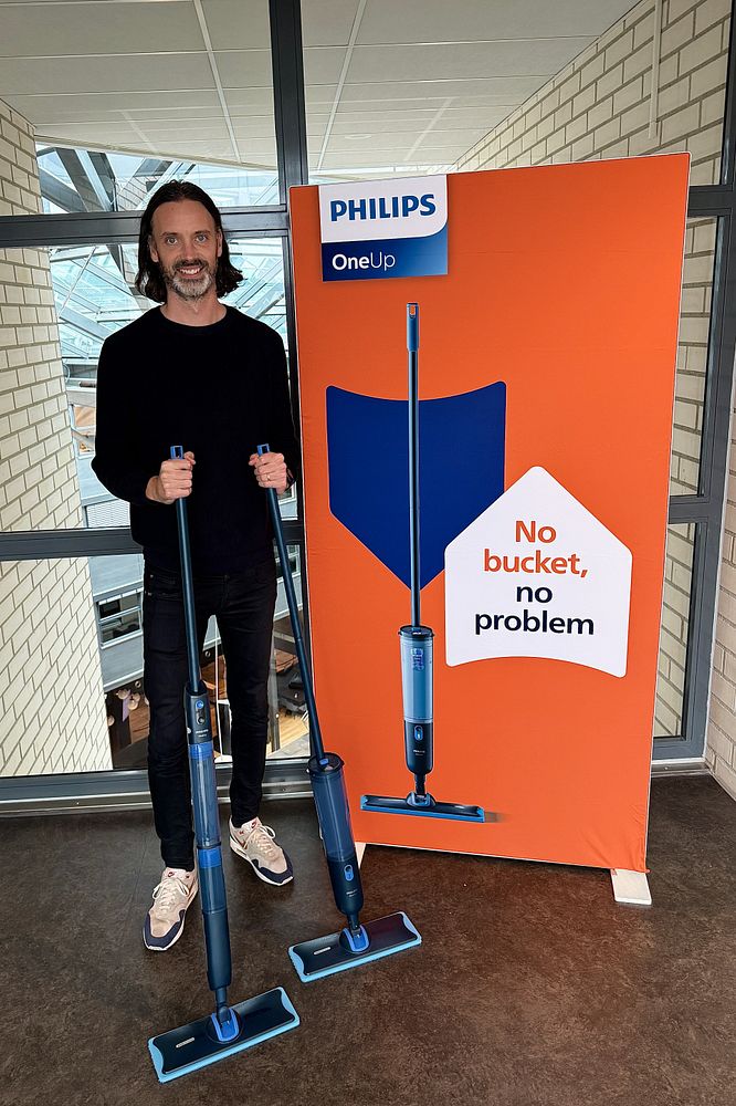 Philips lancerer i dag den elektriske moppe OneUp – og gør op med den gamle måde at vaske gulv på. Med sin patenterede teknologi suger OneUp lydløst det snavsede vand op og fordeler rent vand på gulvet. Det betyder, at man nu kan moppe med rent vand – uden at skulle slæbe rundt på en spand.