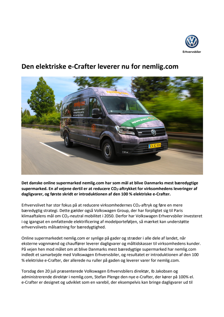 Det danske online supermarked nemlig.com har som mål at blive Danmarks mest bæredygtige supermarked. En af vejene dertil er at reducere CO2-aftrykket for virksomhedens leveringer af dagligvarer, og første skridt er introduktionen af den 100 % elektriske e-Crafter.