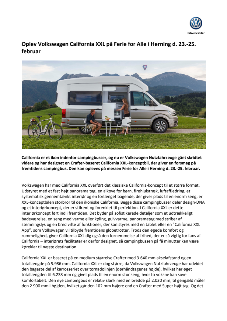 California er et ikon indenfor campingbusser, og nu er Volkswagen Nutzfahrzeuge gået skridtet videre og har designet en Crafter-baseret California XXL-konceptbil, der giver en forsmag på fremtidens campingbus. Den kan opleves på messen Ferie for Alle i Herning d. 23.-25. februar.