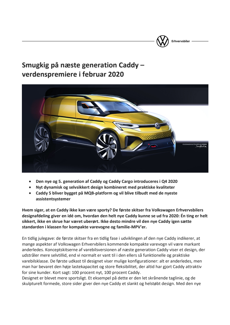 Hvem siger, at en Caddy ikke kan være sporty? De første skitser fra Volkswagen Erhvervsbilers designafdeling giver en idé om, hvordan den helt nye Caddy kunne se ud fra 2020: Én ting er helt sikkert, ikke en skrue har været uberørt. Ikke desto mindre vil den nye Caddy igen sætte standarden i klassen for kompakte varevogne og familie-MPV'er.