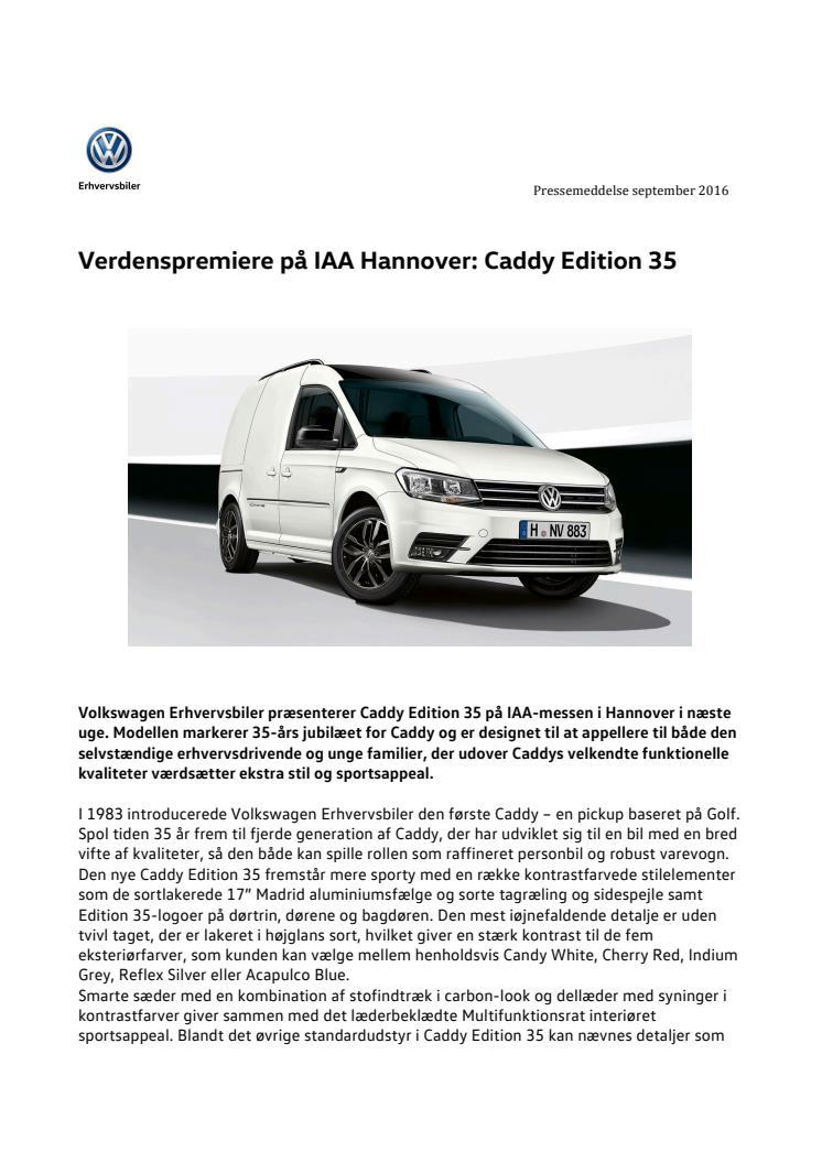 Volkswagen Erhvervsbiler præsenterer Caddy Edition 35 på IAA-messen i Hannover i næste uge. Modellen markerer 35-års jubilæet for Caddy og er designet til at appellere til både den selvstændige erhvervsdrivende og unge familier, der udover Caddys velkendte funktionelle kvaliteter værdsætter ekstra stil og sportsappeal.