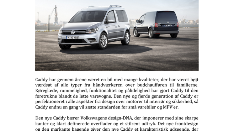 Caddy har gennem årene været en bil med mange kvaliteter, der har været højt værdsat af alle typer fra håndværkeren over budchaufføren til familierne. Køreglæde, rummelighed, funktionalitet og pålidelighed har gjort Caddy til den foretrukne blandt de lette varevogne. Den nye og fjerde generation af Caddy er perfektioneret i alle aspekter fra design over motorer til interiør og sikkerhed, så Caddy endnu en gang vil sætte standarden for små varebiler og MPV’er.