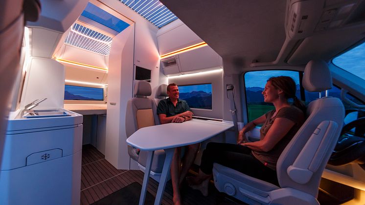 Et 1.100 mm bredt og 3.700 mm langt panoramatag giver glimrende lys i hele interiøret og mulighed for at se op på stjernehimlen. Taget er udstyret med striber af lys hele vejen rundt, hvilket giver et godt lys på dage med dårligt vejr. Lyset kan styres via en tablet og en California XXL App, hvor du kan vælge mellem syv forskellige lysindstillinger inklusiv fire, der er afhængig af tidspunktet på dagen: ”Dag”, ”Nat”, ”Spot”, og ”Sove”. Og skal du sove, har du en 2 meter lang og 1,7 meter bred seng bagest i California. En speciel detalje er, at Californias elektriske system kan bruges til at opvarme sengen om vinteren eller køling om sommeren. Om dagen foldes sengen nemt og hurtigt ned i opbevaringsrum, og sektionen omdannes til opholdsstue.