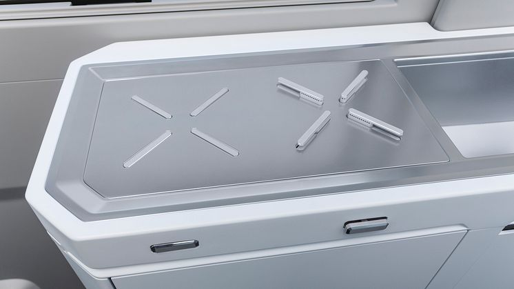 Samme grad af fleksibilitet er også tænkt ind i køkkensektionen. Denne sektion har to køleskabe, en vask, to gasblus og et flytbart skærebord. Køkkenbordet kan efter behov udvides både til venstre og højre side, og med skydedøren åben, kan du stå og kokkerere og servere ud af bilen.