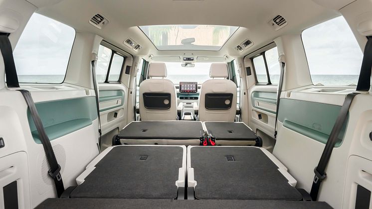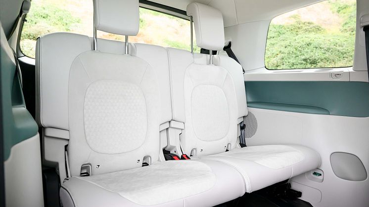 Tredje sæderække. De to individuelle sæder på tredje række kan forskydes i længderetning, ligesom ryglænets vinkel også er justerbar. Hvis ryglænene på anden og tredje sæderække er klappet ned, har man en plan flade helt frem til forsædernes ryglæn. Om nødvendigt kan de to bagerste individuelle sæder fjernes helt. Tredje sæderække er ekstraudstyr, og det vil fremover også kunne bestilles til ID. Buzz NWB, hvor de seks passagerer sidder i en 2+2+2-opstilling.