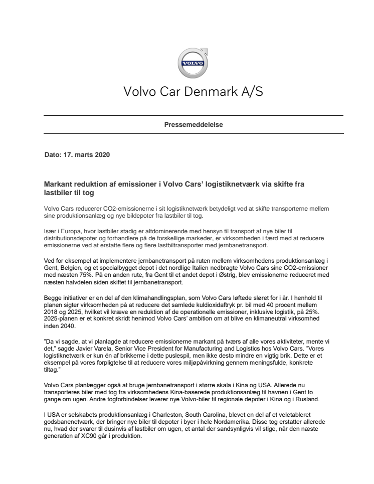 Volvo Cars reducerer CO2-emissionerne i sit logistiknetværk betydeligt ved at skifte transporterne mellem sine produktionsanlæg og nye bildepoter fra lastbiler til tog.