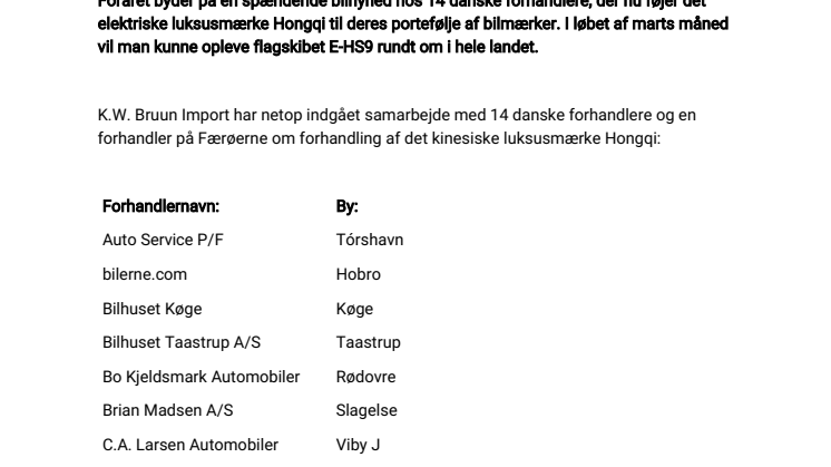 K.W. Bruun Import har netop indgået samarbejde med 14 danske forhandlere og en forhandler på Færøerne om forhandling af det kinesiske luksusmærke Hongqi: